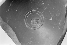 | Description: | The lower part of a deep Sigillata bowl with ring foot. Two grooves around the stamp at the center of the floor: <graphic> | |