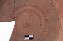 | Description: | Mended from several pieces; about two-thirds preserved with the full profile. Flat bottom, low flaring wall, keeled rim. On the floor, two groups of concentric grooves around an illegible stamp. Light brown clay; orange-red glaze, badly flaked and peeled. Samian. | |