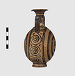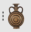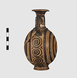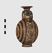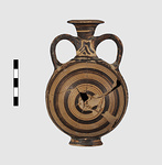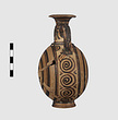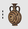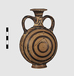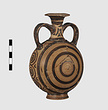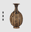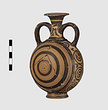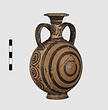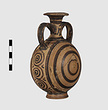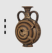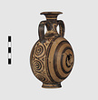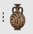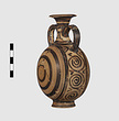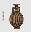 | Description: | Complete save minor chips. Concentric circles on wide faces, running spirals on narrow faces. Rather high, slightly flaring ring foot; band handles; projecting lip decorated on top with two reserved bands. Buff clay; black to brown glaze. | |