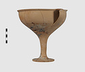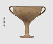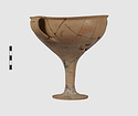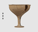 | Description: | Complete save minor chips. Tall stem; two small vertical handles not rising above lip. Small lip out-turned and offset outside. The foot almost a flat disk with a small hollow cone at the center beneath; a groove around its outer vertical face. Pink clay; smooth creamy buff surface on exterior. Unglazed. | |
