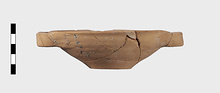 Description:   Complete save minor chips. Two horizontal ribbon handles below rim; small flat foot. The rim flat on top.