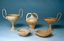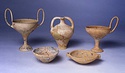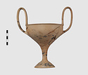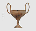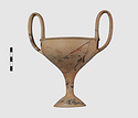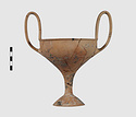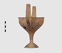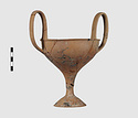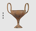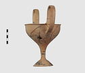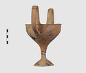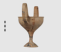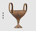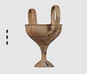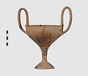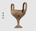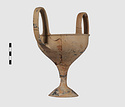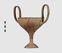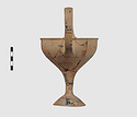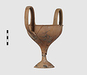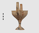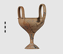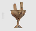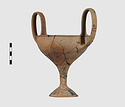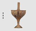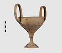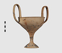 | Description: | Complete save a small fragment and minor chips. Tall stem; two high-swung handles. Flaring conical foot; lip out-turned and offset. Pinkish clay; creamy buff surfaces; unglazed. | |