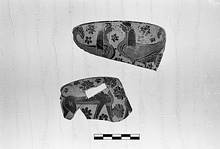 Description:   Numerous fragments made up to two main groups which preserve part of the scene on either side of the vase.