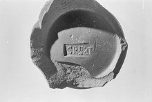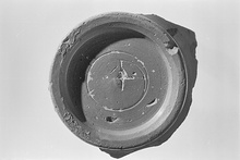 | Description: | Lower part of a small Sigillata bowl with plain ring foot and flaring wall. Stamped at the center of the floor: <graphic> Brownish clay; rather dull red glaze. Cf. Iliffe I (1936), p. 28. | |