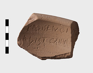 | Description: | Rim and upper wall fragment from a krater of semi-glazed type, but apparently never glazed. Incised inside: <graphic> | |