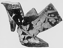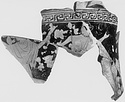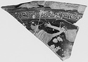 | Description: | Joins P 18414. Fragment from rim of a large stand or kalathos. Straight wall; plain narrow projecting rim, flat on top. Inside glazed; top of rim reserved. Below the rim, maeander; on the wall, the top of a woman's head, left; a purple ribbon around her hair. Behind the head, a fish held by someone else. No relief contour. Peleus and Thetis or Boreas and Orytheia. | |