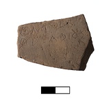 | Description: | Wall fragment from plain pot. Incised outside: <graphic> Pinkish clay, light surface. | |