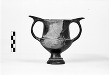 | Description: | About one-third of the rim and body missing. Restored in plaster. Moulded conical foot, with a scratched band just beneath the moulding and on the underside above the resting surface. Dull black glaze, fired red on one side and there worn off. Restored in plaster. | |