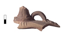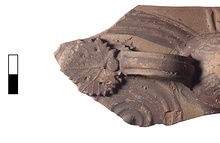 Description:   a) Neck, one handle with relief leaf at base, stub of second handle, and some of body with lines and circles in relief.