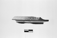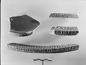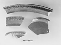 | Description: | A single fragment preserves the profile complete to all but the middle of the floor. Shallow Pergamene plate on broad low ring foot; flat floor very low wall; rim sharply downturned and ornamented with a ring of dots around the upper edge and an egg and dart band in shallow relief around the other face. Typical clay and glaze. | |