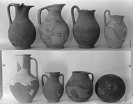 | Description: | Two fragments missing from neck and rim, otherwise complete. Flat handles; low ring base; lip offset outside. Coarse clay; probably once with a pale buff slip as P 1824 and P 1838; traces on the underside of the foot. | |