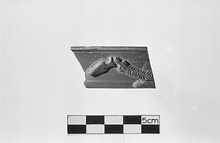 | Description: | Two joining fragments give the profile complete to near center of floor; one small rim piece does not join. High ring foot; flat floor; vertical rim with small rounded lip. Relief decoration on the rim: on the larger fragment a double leaf rosette; on the small piece part of a palm branch garland. On the floor, a broad rouletted band, and concentric grooves. Fine light red clay; good red glaze. Western Sigillata. | |