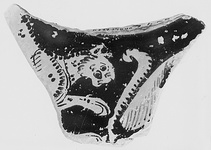 | Description: | Broken all round; thicker toward the center; black glaze inside. On the outside, below the trace of a reserved band, at the left a panther, right, with one paw raised, facing the tail and back(?) of another animal. No relief contours; dilute glaze for the fur(?) of the animal at the right. ADDENDA (Sept. 2020), according to Agora XXX, reversible. | |