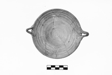 ADDENDA P 18473: Small flattened resting surface, left round; gently sloping floor with wheel ridges towards the top. Ribbon handles, attached at the rim.