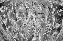 Description:   Mended from many pieces; the rim fragmentary but more than half preserved. Restored in plaster. In the medallion, a rosette; around it a heavy beaded ring from which spring two overlapping rows of ribbed leaves, the alternate leaves longer. On the tip of each shorter leaf, a large krater, ribbed, and with a ribbed base, to either side of which stands a meditative satyr. Large and small rosettes in the field. Upper zone: guilloche, then a row of beading; above, alternating double spirals in pairs, each pair topped by a small leaf.