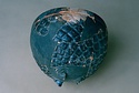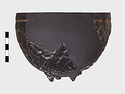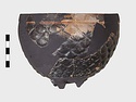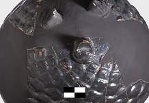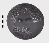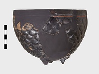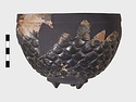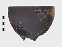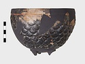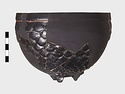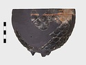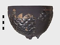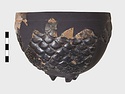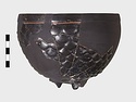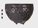 Description:   Walls and rim fragmentary; nothing of the center of the floor preserved. Vertical rim, thickened. Wall covered with large roughly shell-shaped and diamond-shaped nodules. At the base an attached satyr head serves as foot (one preserved).