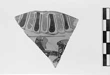 Description:   From the shoulder of a large closed vase. Along the top a tongue pattern, the tongues alternately black and red. In the field a warrior to left, his spear upraised in his right hand, his left arm doubled; all the lower part of his body missing. Behind him, a horse's head, to left.