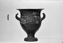 | Description: | Many fragments preserving much of rim, body, and part of both handles; nothing of foot preserved. Restored in plaster. Small bell krater with high, flaring rim, low rounded body, incurved round handles. Three scraped grooves bordering and separating bands of pattern. Decoration in clay paint and thick white: below rim double row of grape vine with clusters in white. In handle zone concentric rectangles alternating with black and white checkerboard panels. Dull black glaze inside and out, shading to red at bottom. | |
