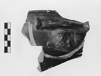| Description: | Three fragments preserve handle, part of rim and wall. Small flat rim separated by two scraped grooves from body of vase. Flat lug handle, round at front edge and terminating at each end in a rotella; pierced with small vertical hole. Directly below handle bearded head in relief with wreath and lappets (Dionysos?). Painted decoration in worn white and clay paint: pendent semicircle around handle; swag(?) on fragment b). Brownish-black glaze inside and out, metallic in spots. ADDENDA Very similar mould: P 18478. | |