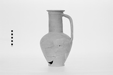Description:   Mended from many fragments; much of wall missing. Tall pitcher with small ring foot, straight sides, rounded shoulder, very high cylindrical neck with ridge just under projecting rim of mouth. Heavy vertical band handle with slight depression at middle, attached under rim and to shoulder.