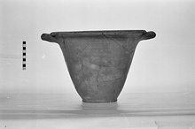 | Description: | Mended from many pieces; part of rim and wall missing. Restored in plaster. Small ring foot; almost straight sides flaring to curved, overhanging rim. Heavy horizontal rolled handles projecting from under rim. Coarse, dark buff clay; dull black glaze on interior, rim, and handles, badly worn. Inside, much light gray incrustation. | |