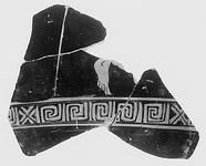 | Description: | Three fragments from the lower wall. Preserved is part of the lower border of the figured panel: maeander broken by St. Andrew's crosses. a) Mended from three pieces. A right foot on tiptoe, right, and the lower part of a staff. b) The left end of the border and part of an uncertain object. c) A small scrap preserving the upper edge of the border and the end of some object. Very good glaze; glaze wash inside. | |
