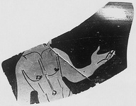 | Description: | Rim fragment. Nude figure facing, preserved from neck to hips, and missing right forearm. Left arm bent at elbow with hand outstretched. Slight use of relief contour. Firm black glaze. | |