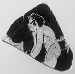 | Description: | Fragment preserving part of small ring foot and flat floor. Inside standing satyr in profile, left, broken off below the knees. The satyr is holding a krater (bit of rim preserved) which is being filled from an amphora: part of neck and shoulder with wreath(?) remain. Partial relief contour. Space inside foot reserved. White for the wreath. | |