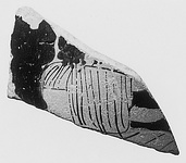 Description:   Fragmentary, preserving base, parts of walls and shoulder, with lower end of handle. Ring foot; rounded body. Egg pattern below figured scene: Eros hovering right, holding out an object (white painted) to a seated female figure at the left. Foot reserved underneath and in narrow band outside.