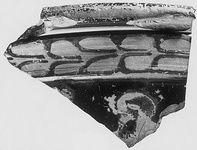 | Description: | Fragment from rim and upper wall of bell krater. Substantial rounded rim; the band below it, decorated with a wreath of short square-ended leaves, set off above and below by a reserved groove. Reserved line below rim inside; inner edge of lip also reserved. On the wall outside, the head of a bearded baldheaded satyr, left (his right arm outstretched?). Next to the break, at the upper left, part of a thyrsos. Glaze black to red; no relief contour. | |