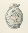 | Description: | A fragment of the rim and one of the neck missing. Low base with flat under- surface, unglazed. Swelling sides, trefoil lip, ribbon handle. In an oval frame with transverse bars between double lines is a lion marchant right with uplifted, curling tail and bristling mane. His mouth is open and shows two rows of teeth. From behind issues a fanciful curving design, perhaps intended to represent a vine-stem. Below the ground line, two double wavy lines may represent water. Other loops and triangles hang in the field from the oval frame. Outside of the main design on either side, spiral and tuft patterns. The chief outline of the drawing is done in blue; the scales and spots of the lion are alternately blue and green, as are the segments of the vine(?) tendril. Buff clay; yellow glaze on interior; white on exterior. | |