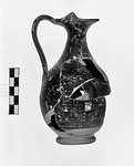 | Description: | Part of trefoil lip and several pieces from side missing. Slender ovoid body; ring foot; narrow neck; trefoil lip; band handle rising from lip. Pinkish-buff clay. Metallic black glaze on outside except on foot and just above. | |