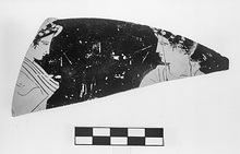 Description:   Single fragment, mended from two, from near the shoulder of a large closed vase. Heads and shoulders of two figures facing; both are wreathed; the one at the left stands right and is close-wrapped in an himation; the one at the right, cloak over shoulders, stands facing, head turned left. Two youths? Relief contour for profile and nape; the hair runs to brown.