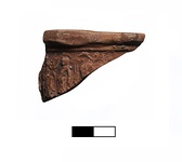 Description:   Rim fragment from small straight-sided bowl; thickened rim, roughly rounded outside; a ridge beneath it. Part of a seated and a standing figure; uncertain representation.