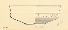 | Description: | Seven fragments make up to three. Restored in plaster. Shallow open bowl on very low ring foot; lower body bulges sharply; steep flaring rim, profile slightly convex. The wall decorated below with vertical horizontal overlapping bands irregular in width; on the bulge a double row of applied darts. A groove below the edge of the rim outside. Thin fabric of gray clay; darker gray surface. | |