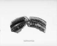 | Description: | Fragment from the foot of a large krater with a double torus moulding. Black glaze on the moulded surfaces only. Incised through the glaze. Joins with P 17915 (joined). Joins P 22992. | |