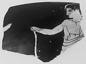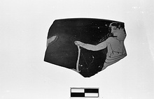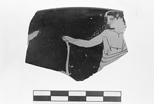 | Description: | Rim fragment; a reserved line at the edge of the rim inside. Exterior: draped youth, partly wrapped in an himation, standing facing, looking left, his right arm outstretched, his hand holding the end of a crooked staff. At the break at the left of the fragment the outstretched hand(?) of a second figure: surface scraped. Possibly an outstretched phiale. Good glaze. Relief contour for the boy's arm. | |