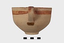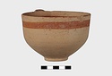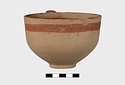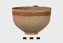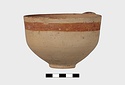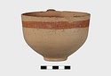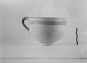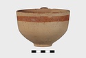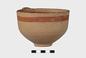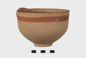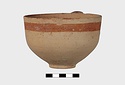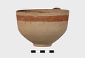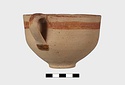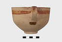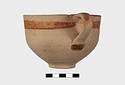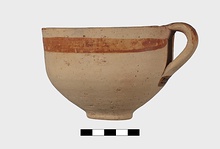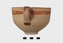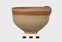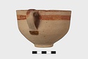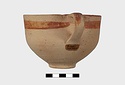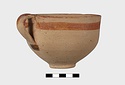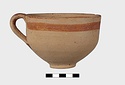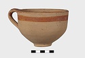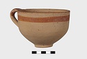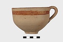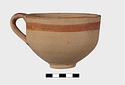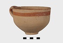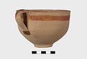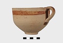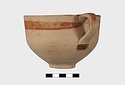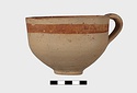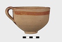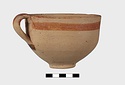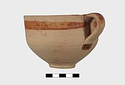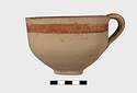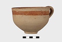 | Description: | One handled cup, complete. Low base; nearly vertical upper wall; plain rim. Single small vertical handle, from rim. Buff clay, covered all over with whitish slip. Decoration in dull red glaze: bands below rim inside and out; on edge of lip, and on handle; ring at center of floor. | |