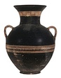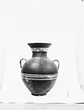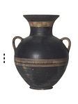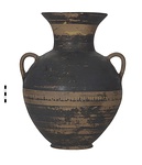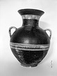 | Description: | Neck and rim broken and mended; small chips missing. Neck amphora with low flaring ring foot; the neck, slightly concave, flares out to a plain rim. Vertical handles set on the shoulder. Reserved zone at point of greatest diameter decorated with a band of tooth pattern between triple horizontal lines. Another, just above the middle of the neck, filled by a quadruple line of key pattern. The outer faces of the handles banded. The inside of the rim glazed to a short distance below the lip. Thick solid black glaze, rather dull but in places slightly metallic, over all outside. | |