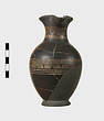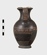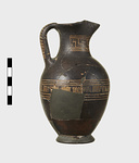| Description: | Mended from many pieces, some burned and some not; small fragments of the body missing, and all of the lower part of the flaring ring foot (perhaps restored too high). Rather tall ovoid body, short neck, slightly concave, and trefoil mouth. Covered over all with thick, slightly shiny glaze, black to reddish-brown. A reserved zone at the level of greatest diameter bordered above and below by triple horizontal lines and decorated with sets of opposed diagonals, the triangles between sets filled in with glaze. A long reserved panel at front and sides of neck decorated with hatched maeander, running to left, between pairs of horizontal lines above and below. Ladder pattern on outer face of band handle. | |