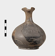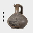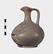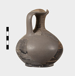 | Description: | Mended from many fragments, most burned, some not; large parts of the body and all of the handle missing. Restored in plaster. Low slightly flaring ring foot and round body with level of greatest diameter low; narrow neck and shallow trefoil mouth. Glazed to level of greatest diameter; below the shoulder a hatched maeander running left between triple lines below and double above. Latticed triangles on the shoulder (four). The neck narrowed and bordered above and below by double lines; between them a triple band of key pattern. The mouth, and the neck under the handle, glazed. Clay buff to gray when burned; thick black glaze, badly peeled: a narrow reserved zone filled by a horizontal line around the lower body above the foot. | |