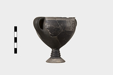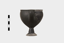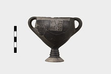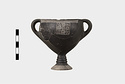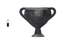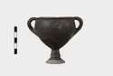 | Description: | Most of the body, and both handles, restored; profile complete. Flaring conical base and ribbed stem (three ribs); deep pointed body and short rim, slightly flared. Vertical handles restored (horizontal ones impossible as there would be traces of attachments). Completely glazed except for rim and edge of base, which is banded with three lines. A square panel reserved at the center, front and back, below the rim: panels divided into nine squares, of which the central and corner ones are decorated with checkerboard or zigzag, the other four are reserved and dotted. The inside glazed, with a reserved line at the rim and dot at the center of the floor. Buff clay grayed by fire; thick solid black glaze, rather dull. | |