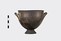 | Description: | Mended from many pieces, some of which do not join; profile complete from foot to rim, with part of one horizontal rolled handle. Most of the body, all of the foot, and one handle restored. Deep rather pointed body slightly flared at the rim. Glazed to below handle zone; three bands between handle zone and glazed lower body. Handle zone divided front and back (apparently nearly identically) by sets of triple vertical lines into narrow columns and panels, decorated with (left to right): 1) Narrow column with zigzag. 2) Slightly wider column with lozenges tangent at their points. 3) Narrow column with zigzag. 4) Narrow panel with parallel horizontal zigzags. 5) Narrow column with zigzag. 6) Slightly wider column with triangles balanced on each other. 7) Narrow column with zigzag. 8) Narrow panel with hatched maeander, vertical, running to left. 9) Slightly wider column with large vertical zigzag, the points of the triangles to each side filled in with glaze, the bases dotted. Two lines below the lip which is glazed. Handle panel reserved; outer face of unglazed handle decorated with glaze lines with hanging tail; another glaze line with hanging tail over handle attachment. Inside glazed, with reserved line at lip; center of floor not preserved. Buff clay, gray where burned; thick solid black glaze, slightly shiny. | |