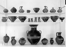 | Description: | Large part of body, rim and foot restored; also both handles, except for stumps. High flaring ring foot and deep rather pointed body with short rim, nearly straight, and vertical band handles. Thick rather dull glaze over all, black to reddish-brown; two reserved lines on outside, and one on inside, of rim. Inside grayed, with reserved dot at center of floor. | |
