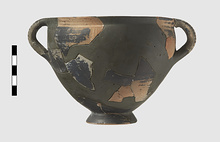 Description:   Mended from many pieces of which several do not join; profile restored by patching. High flaring ring foot, deep rather pointed body, short rim and vertical band handles. Glazed over all; reserved rectangular panels front and back at center of handle zone, probably decorated with multiple key pattern; ladder pattern on handles, double lines on reserved rim. Inside glazed, with reserved line at rim and dot at center of floor.
