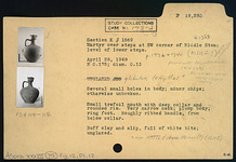 | Description: | Several small holes in body; minor chips; otherwise unbroken. Small trefoil mouth with deep collar and rounded rim. Very narrow neck; plump body; ring foot. Roughly ribbed handle, from below collar. Buff clay and slip, full of white bits; unglazed. ADDENDA Non-Attic: Asia Minor(?) (GRE). | |