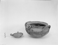 | Description: | Fragments of body and rim missing; and about half of the lid. Coarse handmade bowl with round bottom and one vertical handle; rim flanged inside to receive lid. Convex lid with knob handle. Cooking ware fabric of coarse brown-buff clay, streaks of thin black glaze wash outside. | |