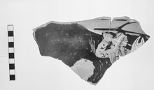 Description:   a) Mended from two pieces, gives part of the scene: Amazon, to right; shield in her left hand, spear in right; also part of olive wreath on the rim; and a handle root.