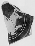 | Description: | Foot and floor fragment of stemless cup on moulded ring foot, the rim offset inside. Beast, right, in medallion inside; palmette under handle outside, and part of a kerchiefed head, to left. Within foot, reserved and glazed circles. Cf. Hesperia Suppl. 10 (1956), p. 19, under no. 41. | |