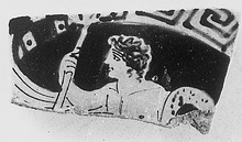 | Description: | Part of the floor, with maeander broken by dotted squares around the medallion. Inside, upper part of youth left, with staff or scepter; to left, drapery or wing; to right, dotted object: serpent(?). ADDENDA (Sept. 2020), according to Agora XXX, Stemless Cup fragment. | |